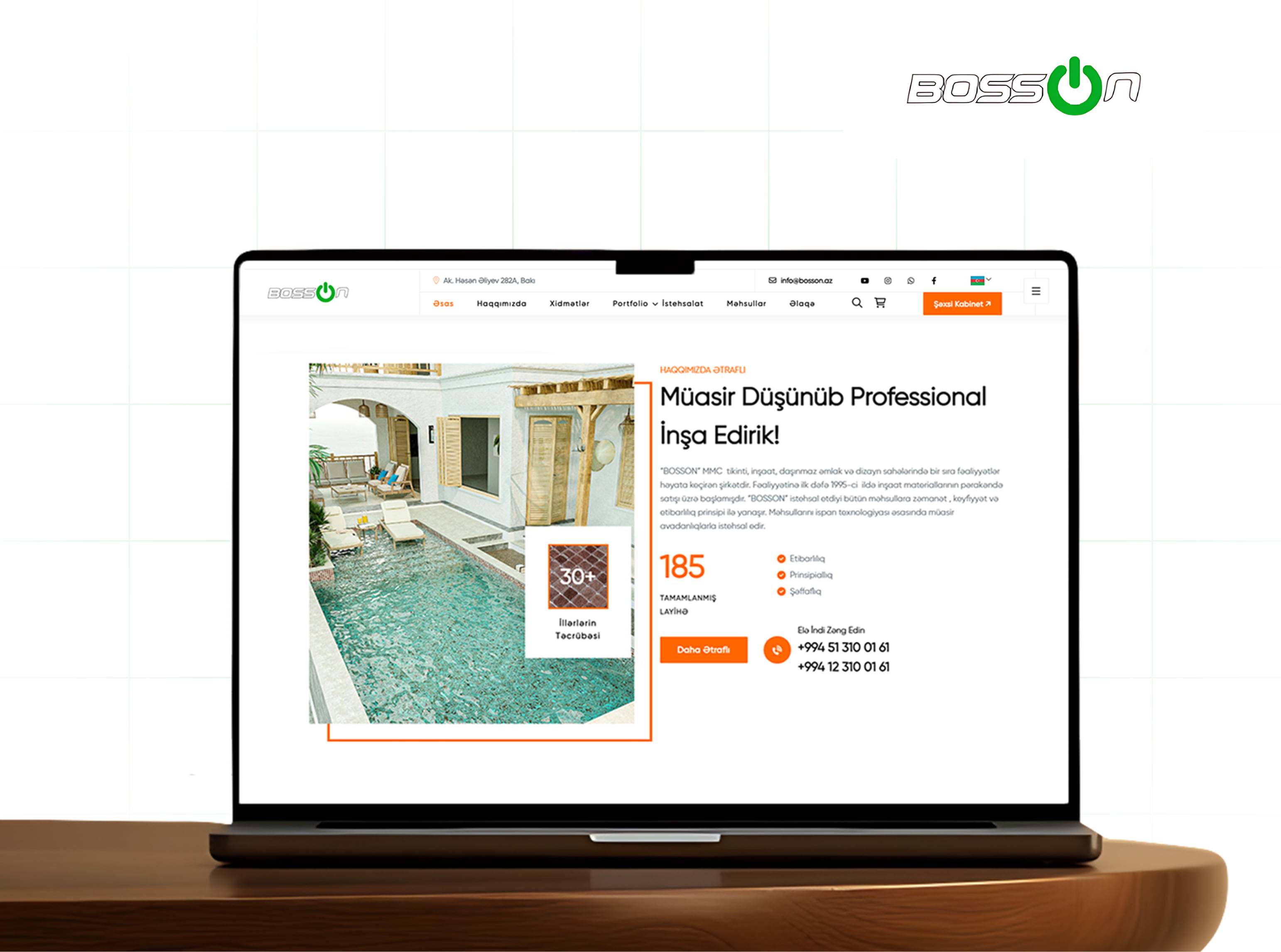 BOSSON MMC üçün köhnə sayt tam yenilənib, daxilindəki B2B sistemi modernləşdirilib və daxili idarəetmə proqramları ilə inteqrasiya olunub. Bu yeniliklər tikinti, inşaat və daşınmaz əmlak xidmətlərinin idarəsini daha səmərəli etdi.