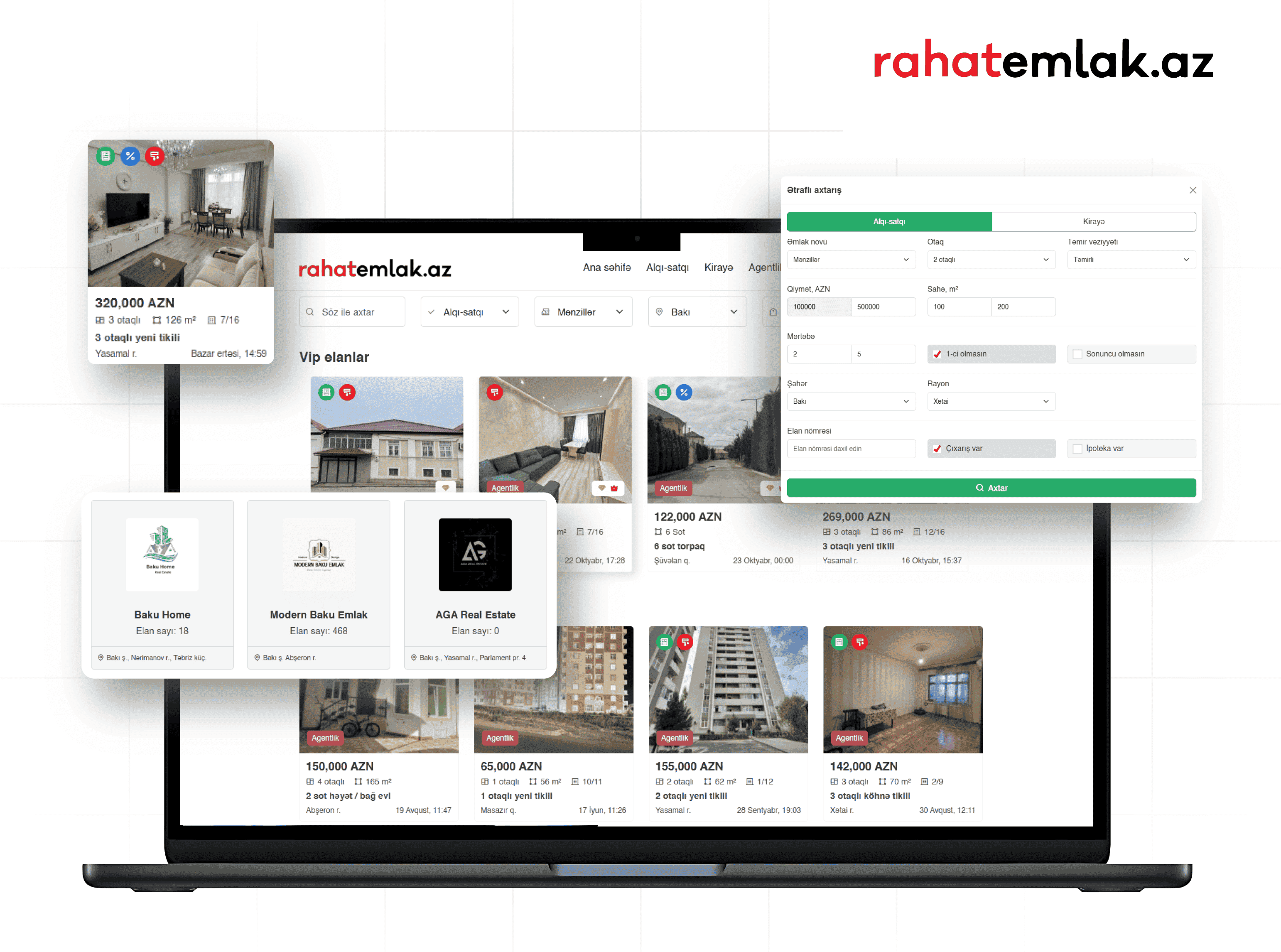 Rahat Əmlak üçün daşınmaz əmlak elan platforması və SEO-uyğun veb sayt hazırlandı. Saytda elan yerləşdirmə, axtarış filtrləri, xəritə inteqrasiyası və mobil uyğun dizayn kimi funksiyalar yer alır.
